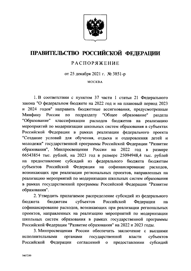 Распоряжение Правительства Российской Федерации от 25.12.2021 № 3851-р