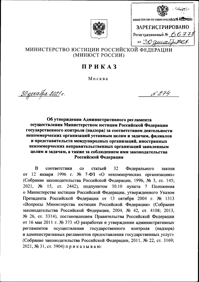 Приказ Министерства юстиции Российской Федерации от 30.12.2021 № 274