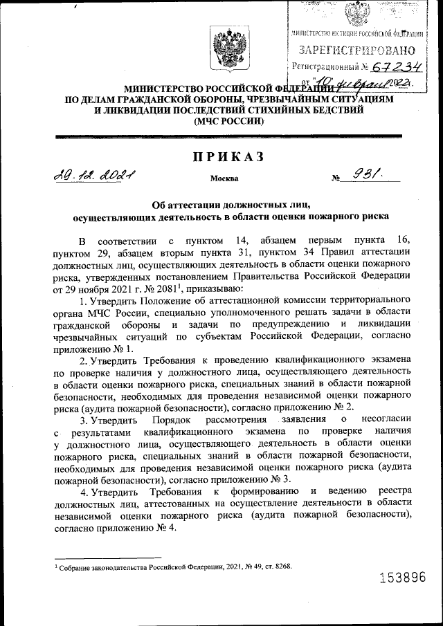 Приказ Министерства Российской Федерации по делам гражданской обороны, чрезвычайным ситуациям и ликвидации последствий стихийных бедствий от 29.12.2021 № 931