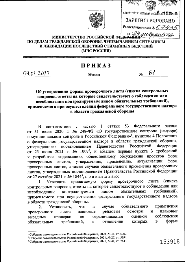Приказ Министерства Российской Федерации по делам гражданской обороны, чрезвычайным ситуациям и ликвидации последствий стихийных бедствий от 04.02.2022 № 61