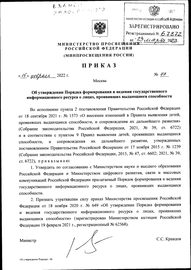Приказ Министерства просвещения Российской Федерации от 15.02.2022 № 77