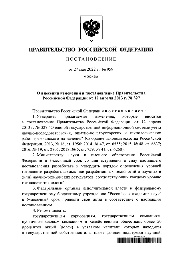 Постановление Правительства Российской Федерации от 27.05.2022 № 959