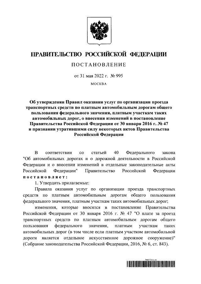 "Об утверждении Правил оказания услуг по организации проезда транспортных средств по платным автомобильным дорогам общего пользования федерального значения, платным участкам таких автомобильных дорог, о внесении изменений в постановление Правительства Российской Федерации от 30 января 2016 г. № 47 и признании утратившими силу некоторых актов Правительства Российской Федерации"