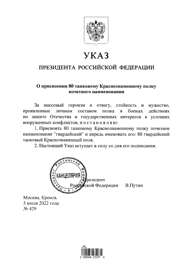 Указ Президента Российской Федерации от 05.07.2022 № 429