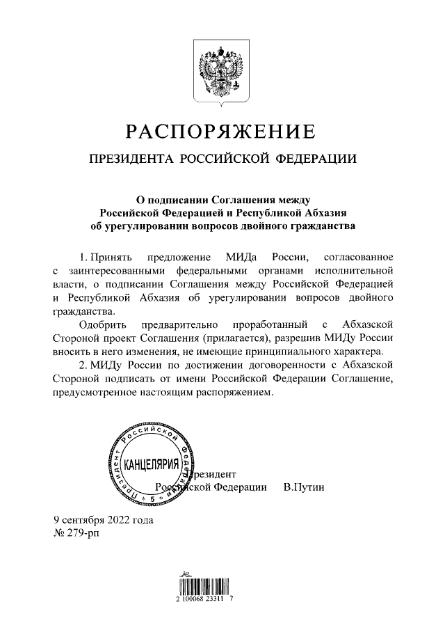 "О подписании Соглашения между Российской Федерацией и Республикой Абхазия об урегулировании вопросов двойного гражданства"