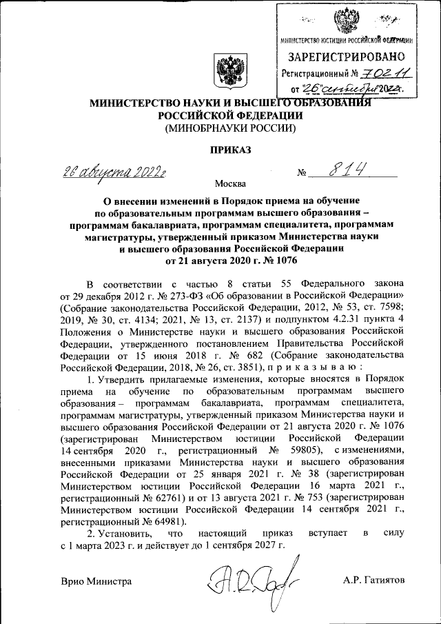 Приказ Министерства науки и высшего образования Российской Федерации от 26.08.2022 № 814