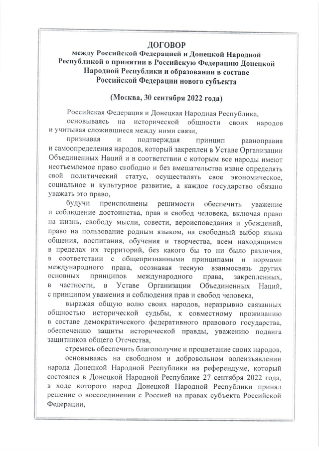 Договор между Российской Федерацией и Донецкой Народной Республикой о принятии в Российскую Федерацию Донецкой Народной Республики и образовании в составе Российской Федерации нового субъекта от 30 сентября 2022 года