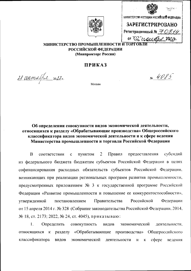 Приказ Министерства промышленности и торговли Российской Федерации от 28.09.2022 № 4085