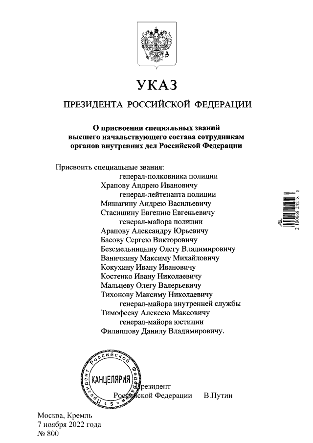Указ Президента Российской Федерации от 07.11.2022 № 800