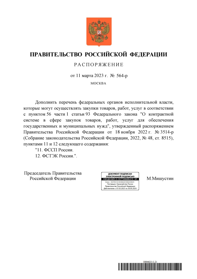 Распоряжение Правительства Российской Федерации от 11.03.2023 № 564-р