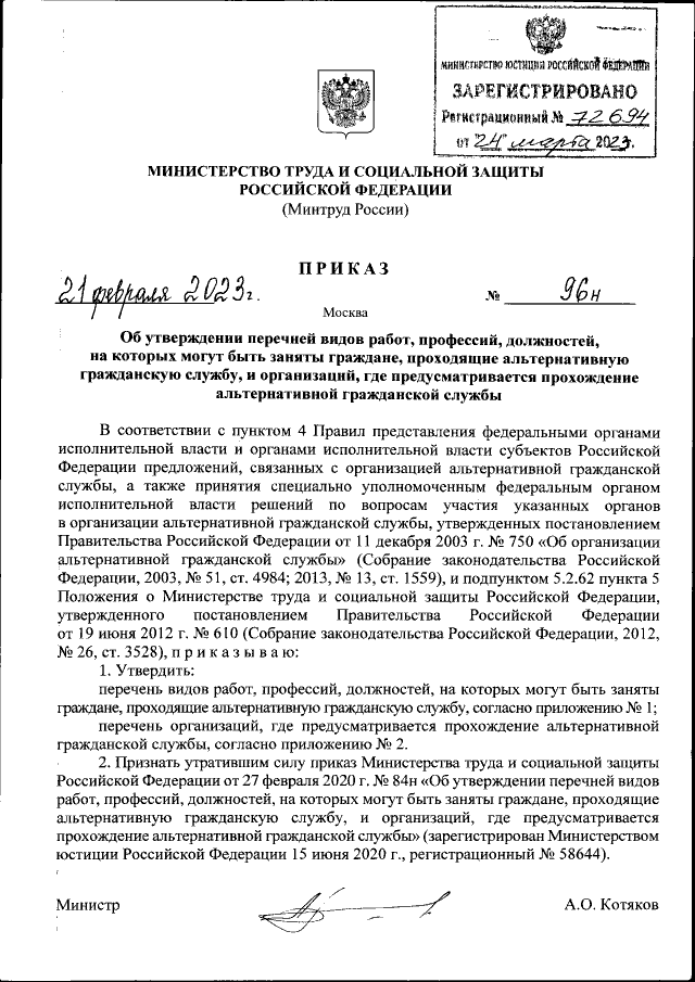 Приказ Министерства труда и социальной защиты Российской Федерации от 21.02.2023 № 96н