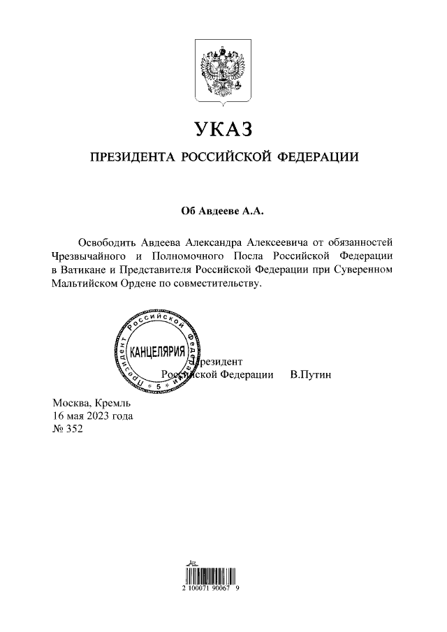 Указ Президента Российской Федерации от 16.05.2023 № 352