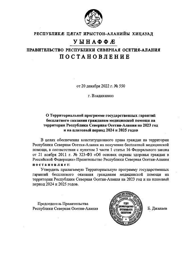 Постановление Правительства Республики Северная Осетия - Алания от 20.12.2022 № 550