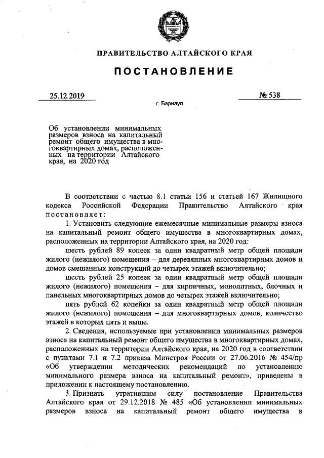 "Об установлении минимальных размеров взноса на капитальный ремонт общего имущества в многоквартирных домах, расположенных на территории Алтайского края, на 2020 год"