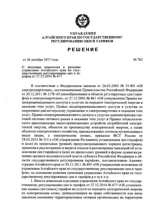 Решение Управления Алтайского края по государственному регулированию цен и тарифов от 26.12.2017 № 762