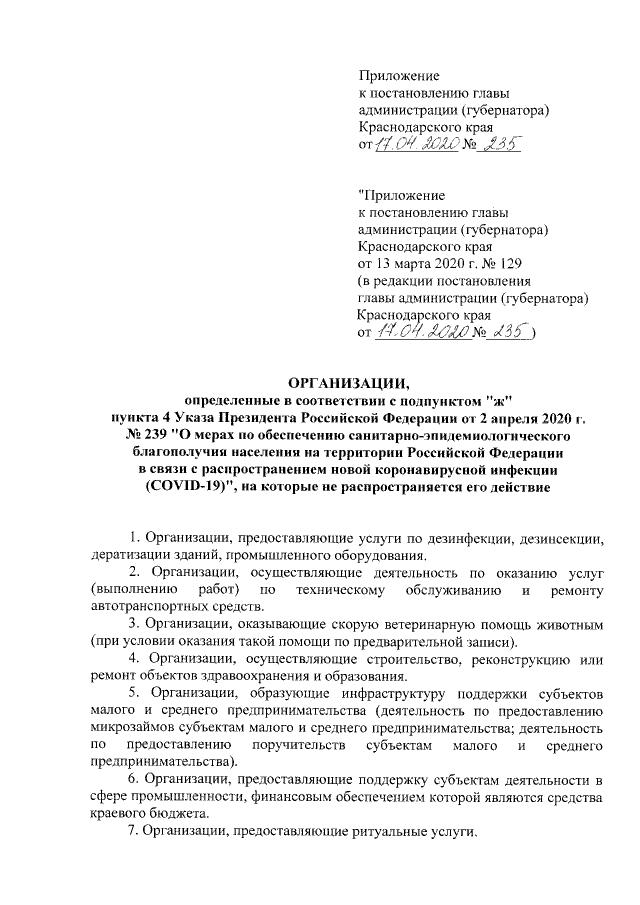Постановление главы администрации (губернатора) Краснодарского края от 17.04.2020 № 235