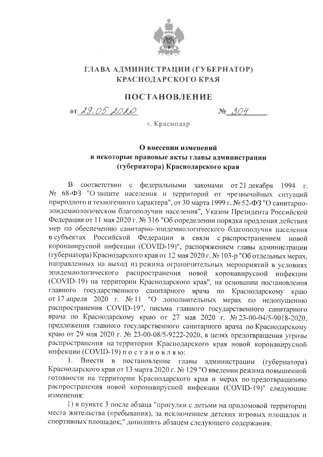 Постановление главы администрации (губернатора) Краснодарского края от 29.05.2020 № 304