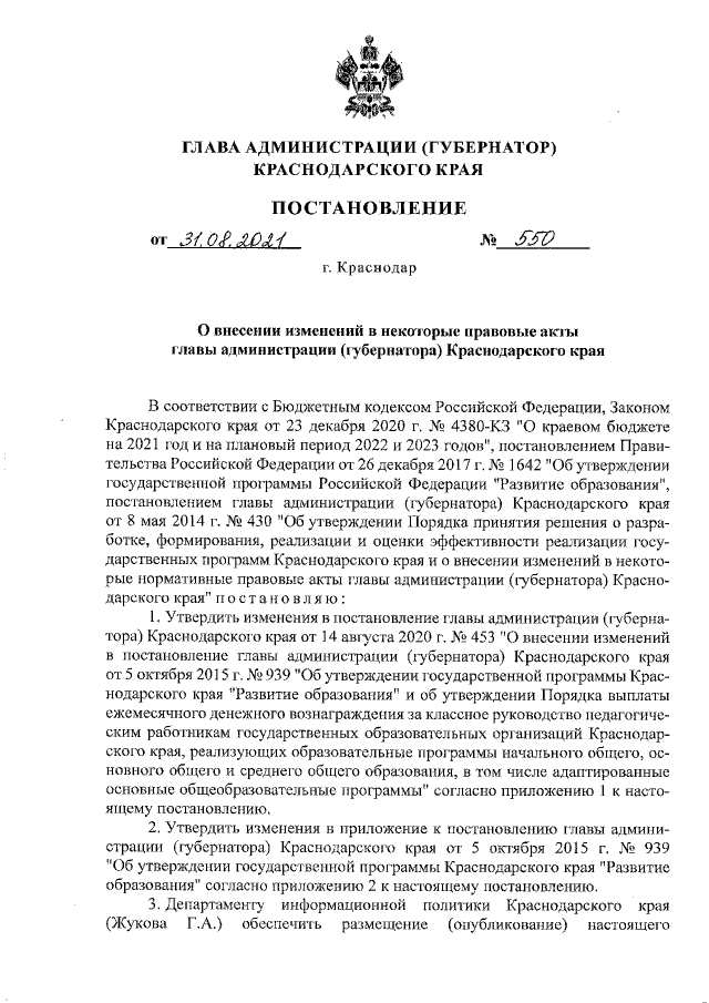 Постановление главы администрации (губернатора) Краснодарского края от 31.08.2021 № 550