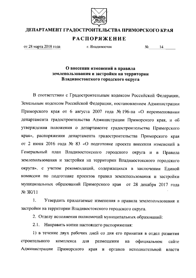 Распоряжение департамента градостроительства Приморского края от 28.03.2018 № 14
