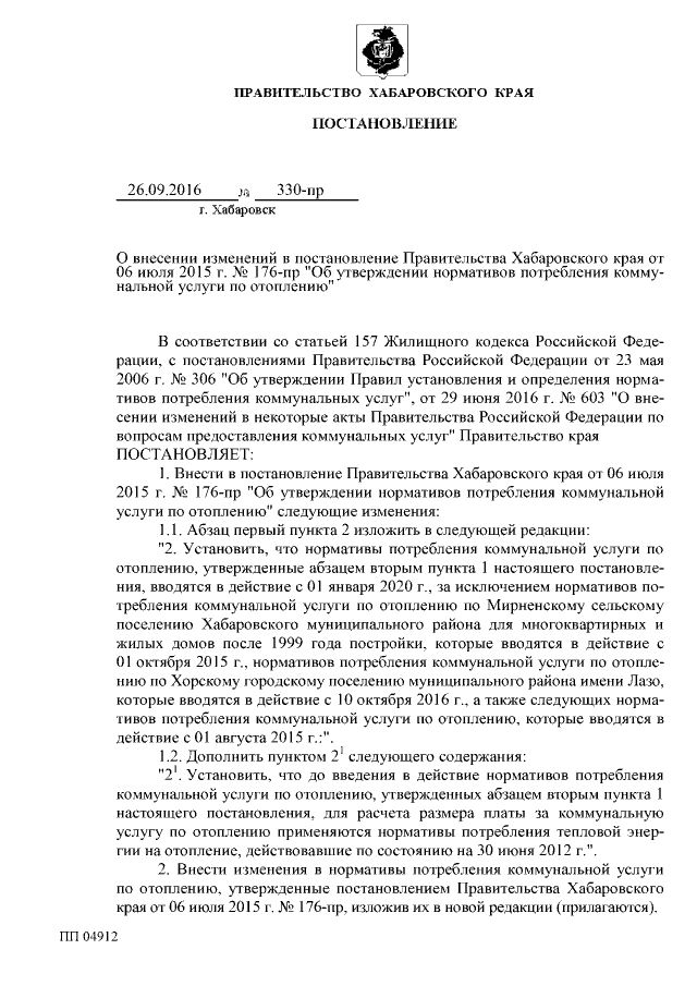 "О внесении изменений в постановление Правительства Хабаровского края от 06 июля 2015 г. № 176-пр "Об утверждении нормативов потребления коммунальной услуги по отоплению"