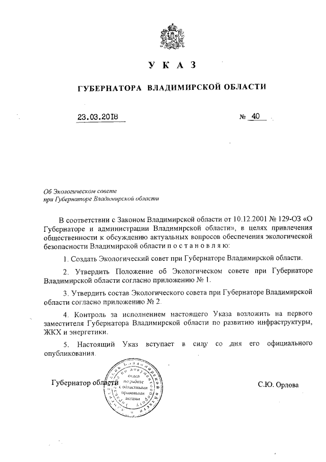 Указ Губернатора Владимирской области от 23.03.2018 № 40