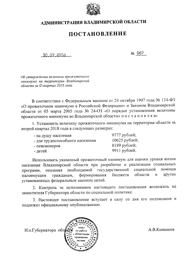 "Об утверждении величины прожиточного минимума на территории Владимирской области за II квартал 2018 года"