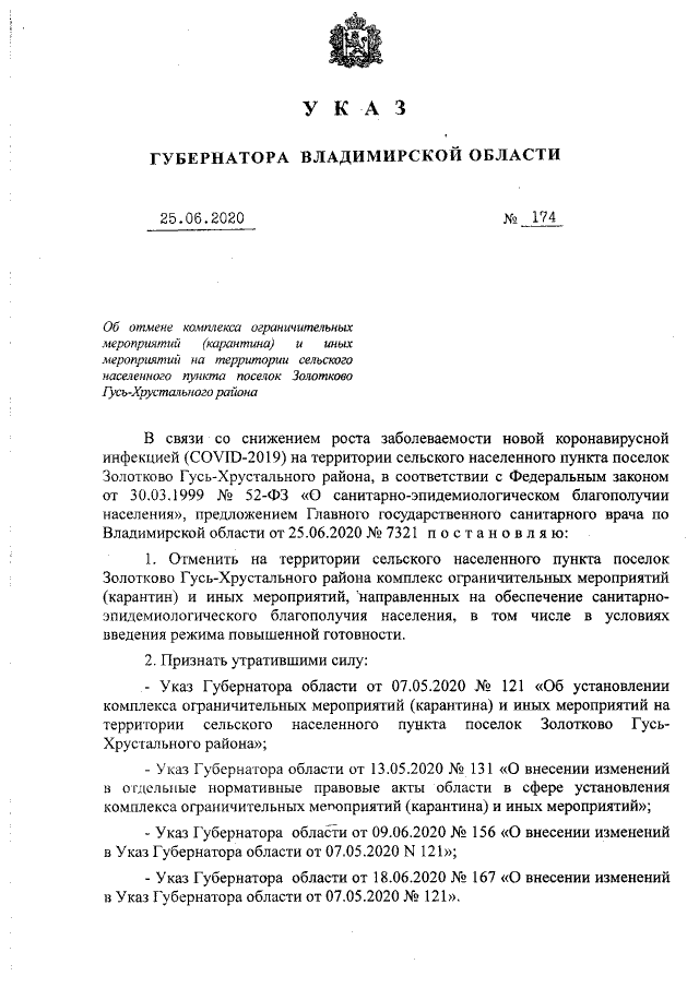 Указ Губернатора Владимирской области от 25.06.2020 № 174