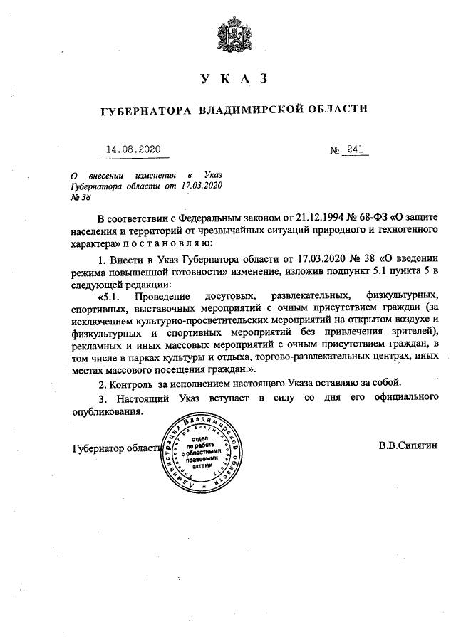 Указ Губернатора Владимирской области от 14.08.2020 № 241