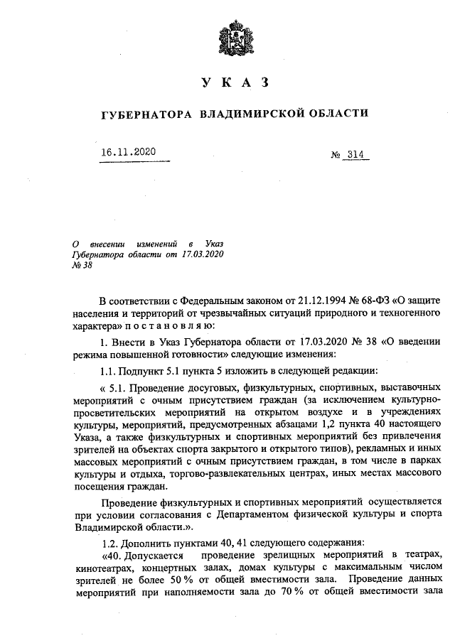 Указ Губернатора Владимирской области от 16.11.2020 № 314