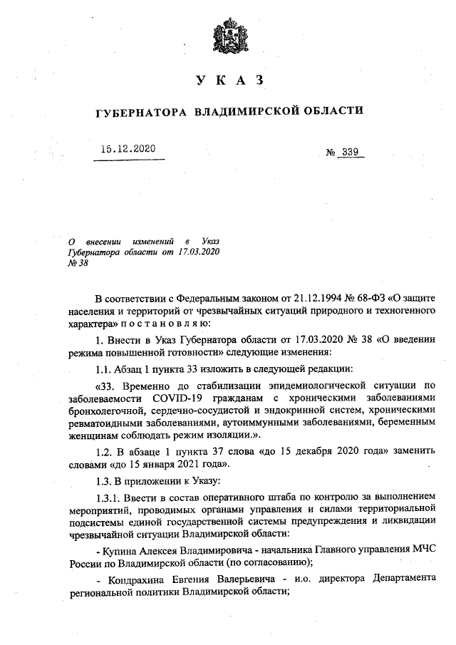 Указ Губернатора Владимирской области от 15.12.2020 № 339
