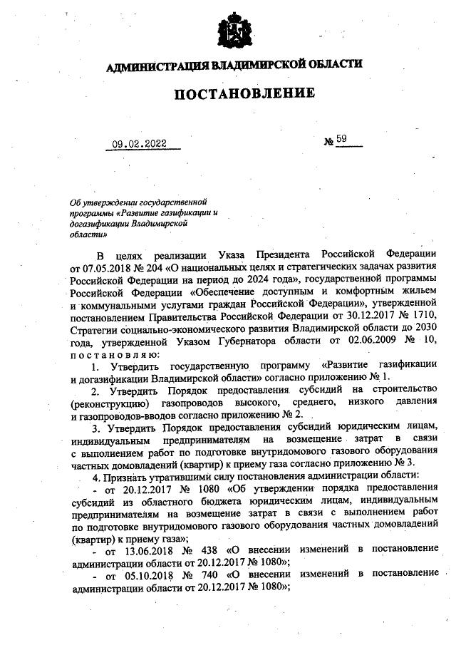 Постановление администрации Владимирской области от 09.02.2022 № 59
