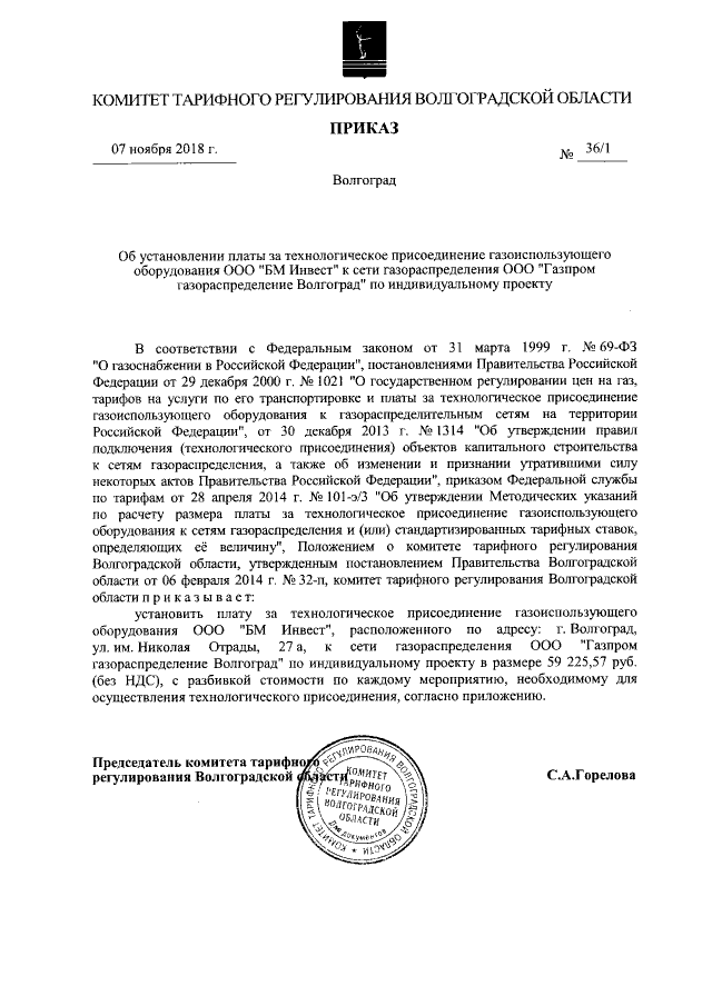 "Об установлении платы за технологическое присоединение газоиспользующего оборудования ООО "БМ Инвест" к сети газораспределения ООО "Газпром газораспределение Волгоград" по индивидуальному проекту"