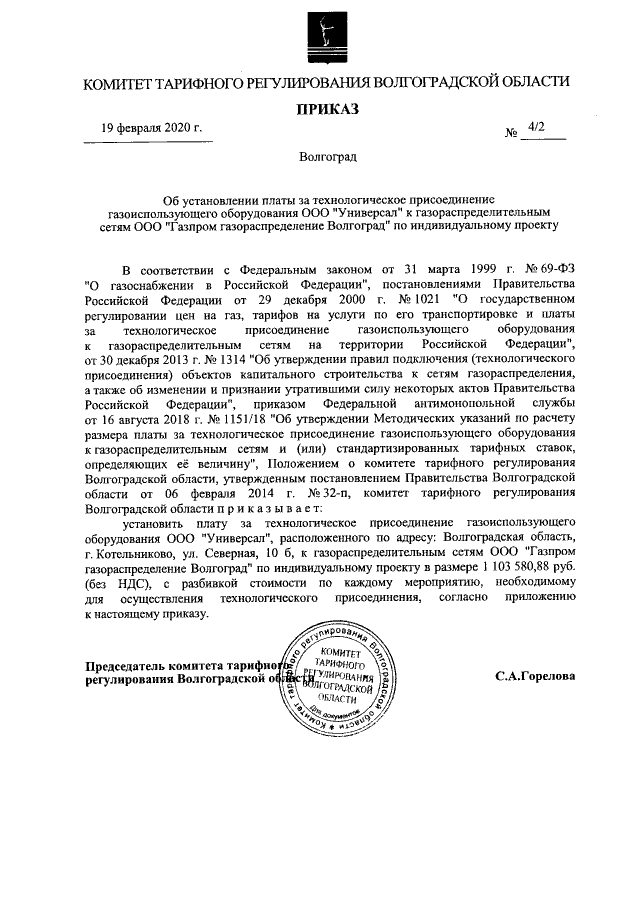 "Об установлении платы за технологическое присоединение газоиспользующего оборудования ООО "Универсал" к газораспределительным сетям ООО "Газпром газораспределение Волгоград" по индивидуальному проекту"
