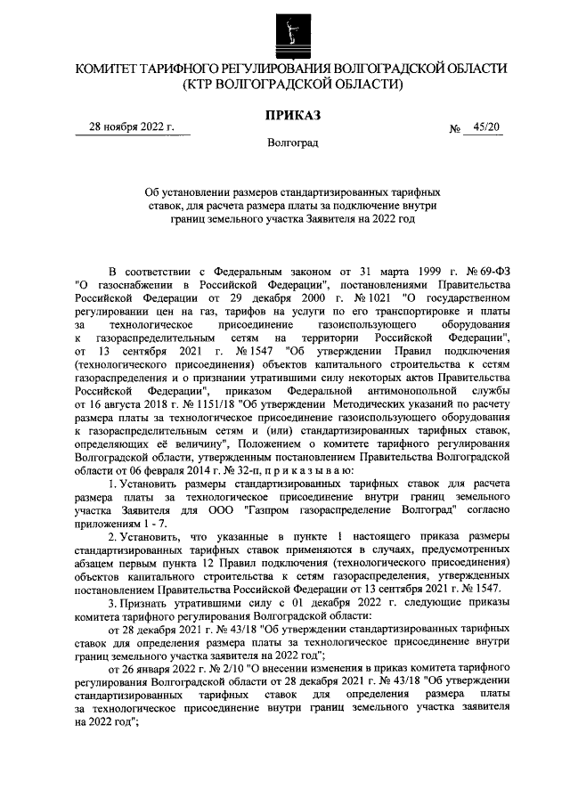 Приказ комитета тарифного регулирования Волгоградской области от 28.11.2022 № 45/20