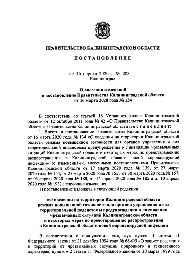 Постановление Правительства Калининградской области от 15.04.2020 № 208