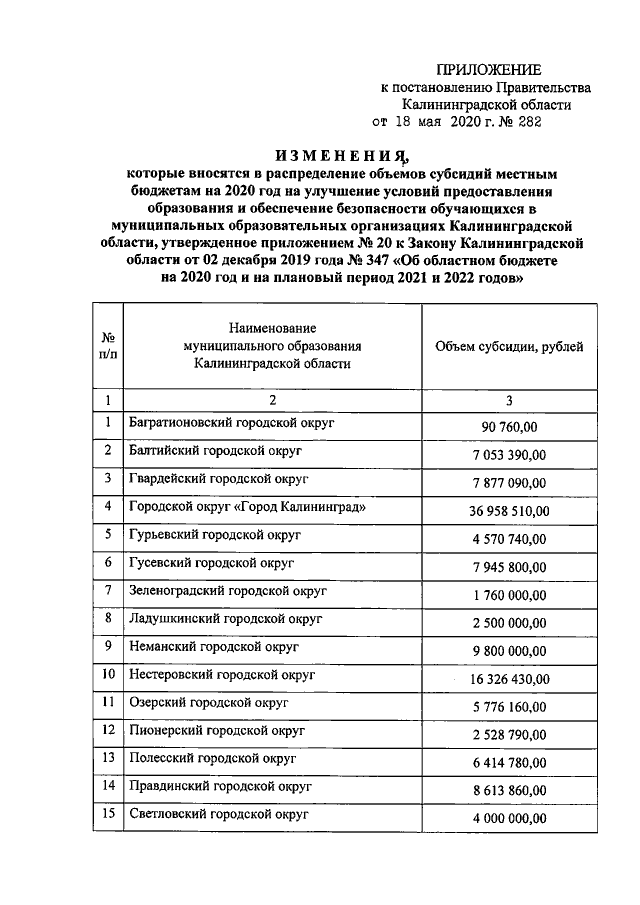 Постановление Правительства Калининградской области от 18.05.2020 № 282
