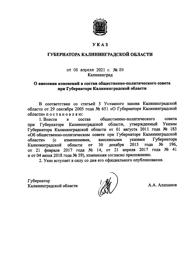 Указ Губернатора Калининградской области от 06.04.2021 № 29