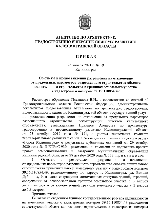 "Об отказе в предоставлении разрешения на отклонение от предельных параметров разрешенного строительства объекта капитального строительства в границах земельного участка с кадастровым номером 39:15:110854:49"