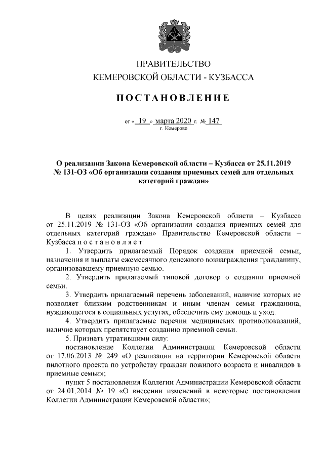 Постановление Правительства Кемеровской области - Кузбасса от 19.03.2020 № 147