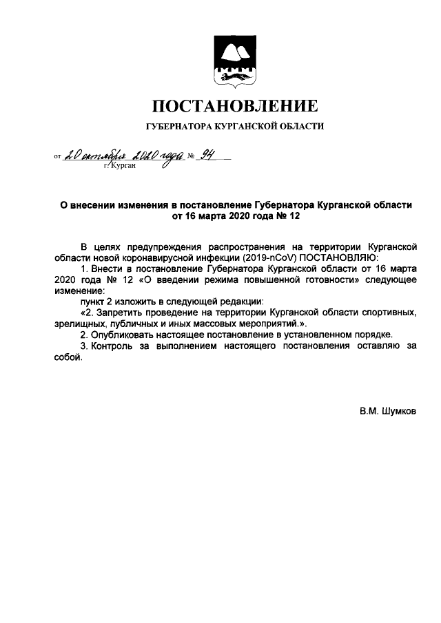 Постановление Губернатора Курганской области от 20.10.2020 № 94