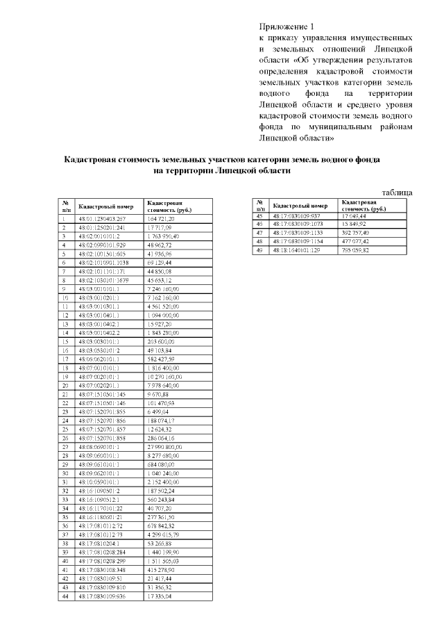 "Об утверждении результатов определения кадастровой стоимости земельных участков категории земель водного фонда на территории Липецкой области и среднего уровня кадастровой стоимости земель водного фонда по муниципальным районам Липецкой области"