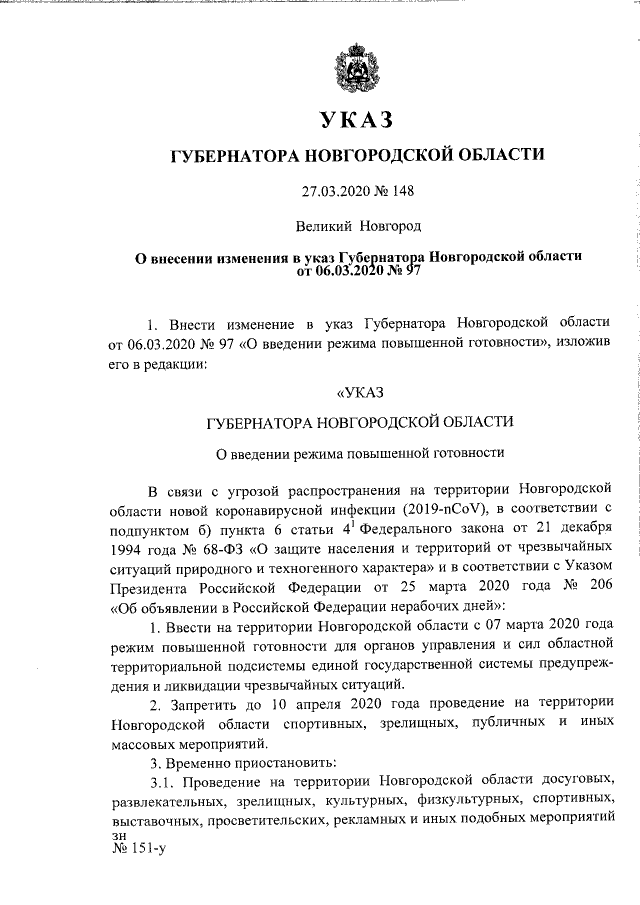 Указ Губернатора Новгородской области от 27.03.2020 № 148
