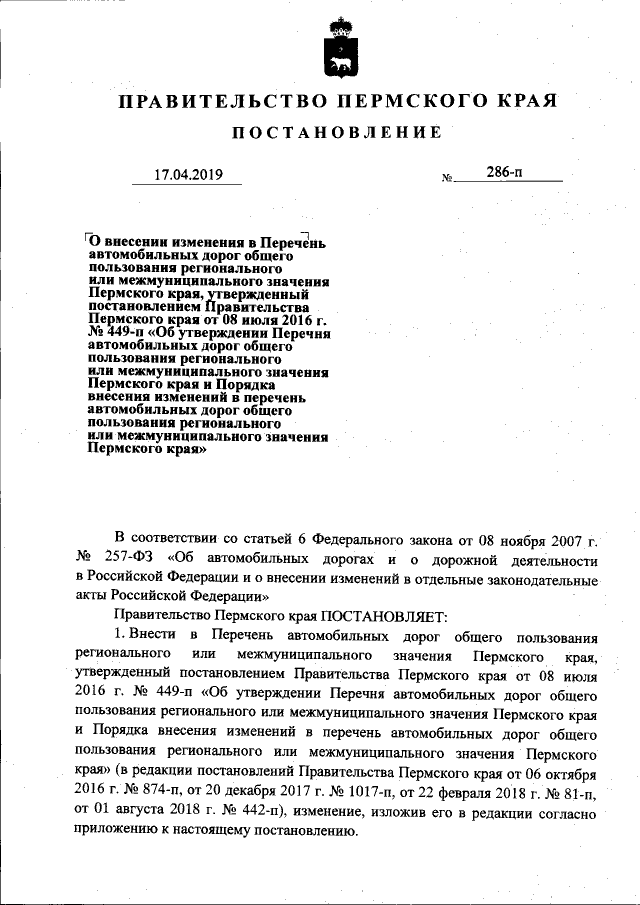 "О внесении изменения в Перечень автомобильных дорог общего пользования регионального или межмуниципального значения Пермского края, утвержденный постановлением Правительства Пермского края от 08 июля 2016 г. № 449-п "Об утверждении Перечня автомобильных дорог общего пользования регионального или межмуниципального значения Пермского края и Порядка внесения изменений в перечень автомобильных дорог общего пользования регионального или межмуниципального значения Пермского края"