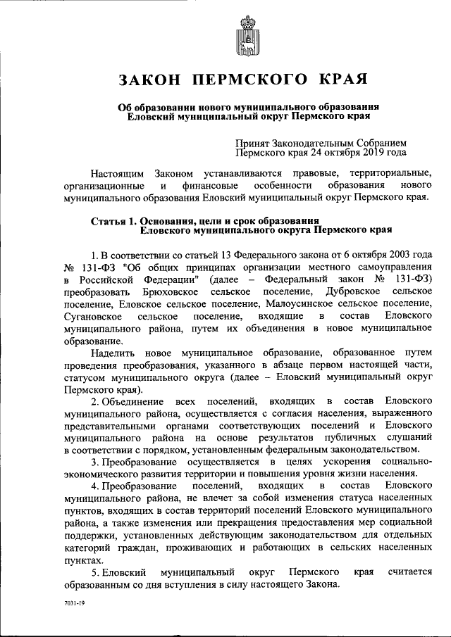 "Об образовании нового муниципального образования Еловский муниципальный округ Пермского края"