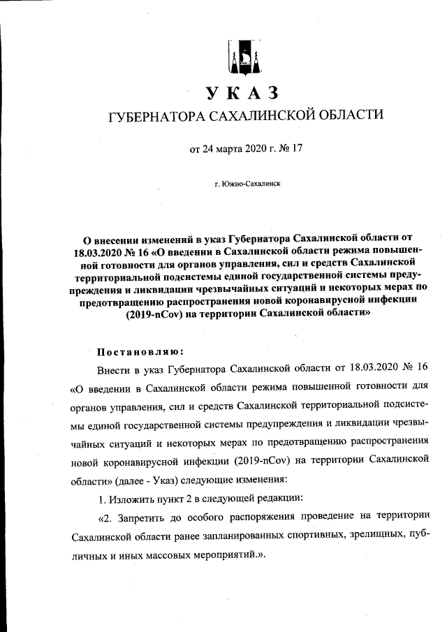 Указ Губернатора Сахалинской области от 24.03.2020 № 17