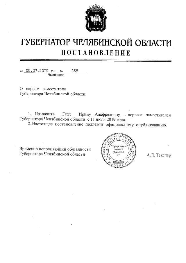 Постановление Губернатора Челябинской области от 09.07.2019 № 268