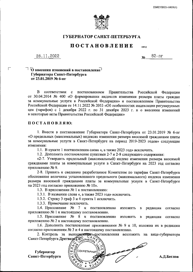 Постановление Губернатора Санкт-Петербурга от 28.11.2022 № 82-пг