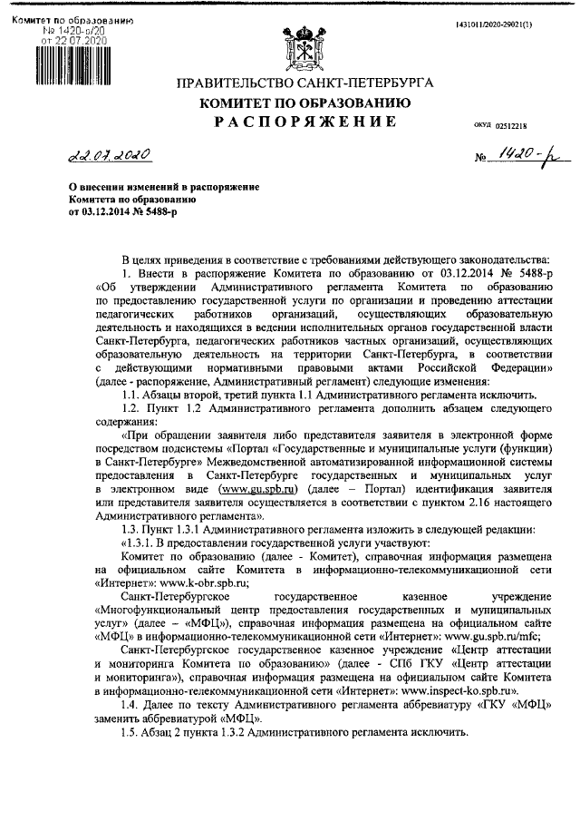Распоряжение Комитета по образованию Санкт-Петербурга от 22.07.2020 № 1420-р