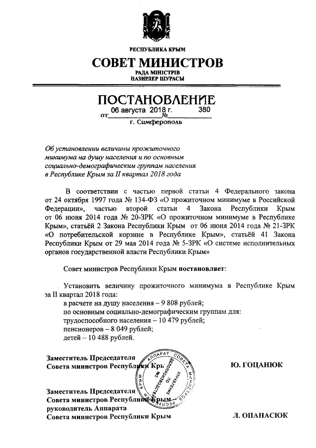"Об установлении величины прожиточного минимума на душу населения и по основным социально-демографическим группам населения в Республике Крым за II квартал 2018 года"
