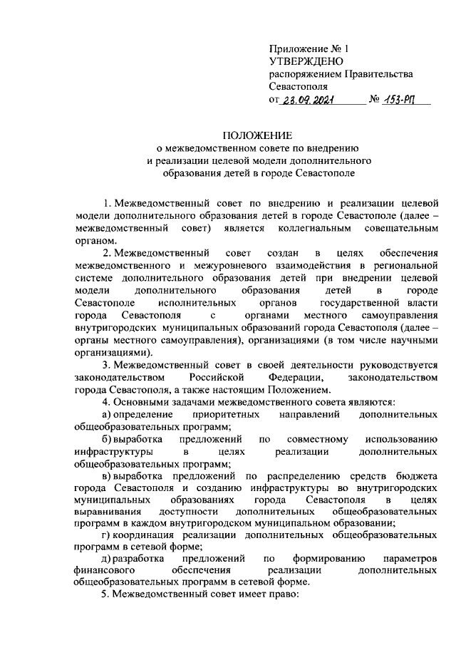 Распоряжение Правительства Севастополя от 23.09.2021 № 153-РП